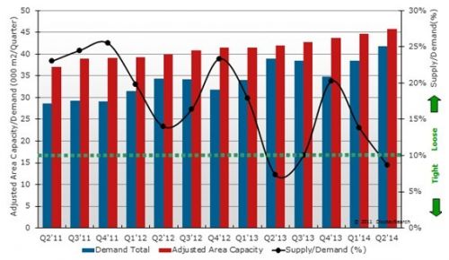 由于面板廠商在過去六個季度連續(xù)虧損,且產(chǎn)業(yè)處于不景氣階段且仍將維持一段時間,面板廠商凍結(jié)了所有液晶電視產(chǎn)線的擴張計劃。與此同時,面板價格下降,增加了市場需求,尤其是50寸及以上的大尺寸電視面板。因此NPD DisplaySearch預(yù)測特別是在2013年,面板供需平衡將較為緊張,供需過剩比將自2010年第二季度以來首度下降到10%以下。由此,NPD DisplaySearch預(yù)計平板產(chǎn)業(yè)將開始新的循環(huán)周期,面板價格將逐步上升,利潤得以提高,并促使投資增加。
