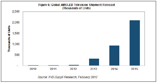 據(jù)IHS iSuppli公司的中小顯示器研究報(bào)告,2015年全球AMOLED電視出貨量預(yù)計(jì)將達(dá)到210萬臺,而2012年只有3.4萬臺。雖然增幅巨大,但到2015年AMOLED電視在全球平板電視市場中的份額仍然將只有1%。