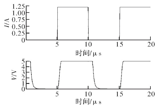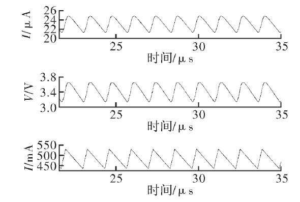 為驗證文中提出的電流采樣電路的功能,結(jié)合滯環(huán)控制電路及外部負(fù)載在Cadence中進(jìn)行了仿真。圖5為輸入電壓20 V時采樣電流、電壓與負(fù)載電流的關(guān)系。由圖可見,采樣電流與采樣電壓隨負(fù)載電流同相周期性變化,周期約為1.2μs.