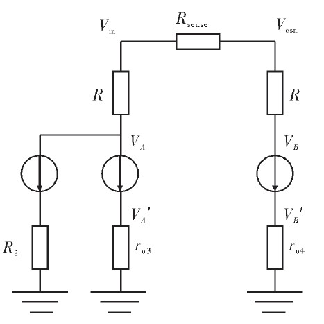 在實際電路中,VA對VB的匹配度直接影響采樣精度。圖3為簡化的小信號模型。圖4為實際電路圖。Vin與Vcsn為精確采樣電阻Rcsn兩端電壓,輸入范圍8~40 V;Vcc為芯片內(nèi)部5 V穩(wěn)定電源。