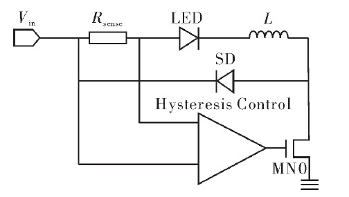 圖1是滯環(huán)控制電路框圖。LED驅(qū)動電流的變化反映在Rsense兩端的壓差變化上。滯環(huán)電流控制模塊內(nèi)設(shè)兩個電流閾值Imax和Imin,當(dāng)電路接上電源時,功率管打開,電源通過Rsense、負(fù)載LED向電感L充電,驅(qū)動電流上升。當(dāng)電流>Imax時,控制電路輸出低電平關(guān)閉功率開關(guān)管。此時電感通過負(fù)載LED、Rsense和肖特基二極管放電,電流下降。當(dāng)驅(qū)動電流<Imin時,控制電路輸出高電平打開功率開關(guān)管,重復(fù)上一個周期的動作。通過這種方式控制電路將驅(qū)動電流限制在Imax與Imin之間周期性變化,使流過LED的平均驅(qū)動電流值恒定。