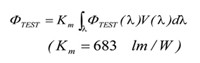yaux,TEST (λ)為不點(diǎn)亮待測(cè)樣品,點(diǎn)亮輔助燈,在此系統(tǒng)下的光譜輻射計(jì)的讀值;yaux,REF (λ)則為不點(diǎn)亮參照標(biāo)準(zhǔn)燈,點(diǎn)亮輔助燈時(shí),在此系統(tǒng)下的光譜輻射計(jì)讀值。從測(cè)得的ΦTEST (λ)(單位:W/奈米)總分光輻射通量,可使用公式(3)計(jì)算總光通量 ΦTEST (單位:流明)。