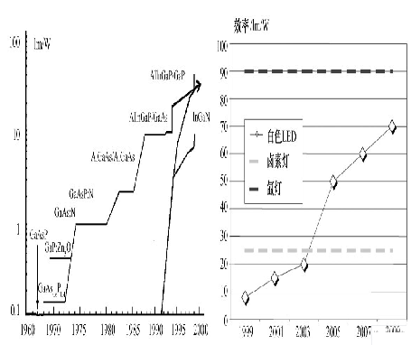 圖2 LED 發(fā)光效率發(fā)展趨勢(shì)( 左) 及與傳統(tǒng)光源效率比較( 右)