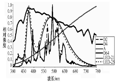 圖3 白熾燈(A)、HID (D2 /D4)、白色LED 及日光光譜(D65)