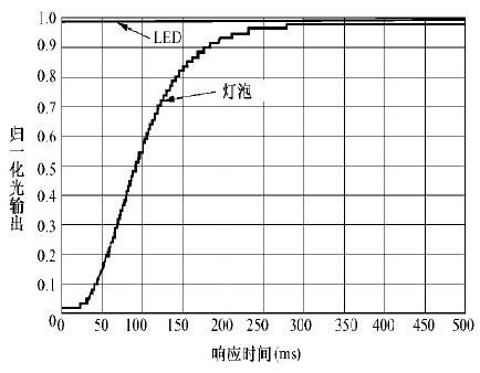 圖4 LED 與傳統(tǒng)光源點(diǎn)亮相應(yīng)時(shí)間對(duì)比