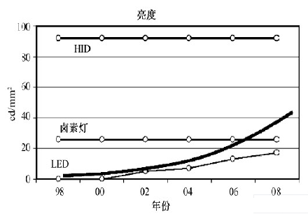 發(fā)光效能上, 隨著近年LED 材料結(jié)構(gòu)學(xué)的進(jìn)展,LED 的發(fā)光效率也飛速提高。前照燈應(yīng)用方面,2009 年, 白光LED 的發(fā)光效能也已達(dá)到70lm /W ( 見(jiàn)圖2 )。而且LED 燈具將絕大部分的能量轉(zhuǎn)化為光能,作為熱量損失掉的僅是一小部分。據(jù)估計(jì), 用LED 取代鹵素?zé)裟芴嵘?chē)的mpg 指標(biāo)( 每加侖燃油的行駛英里數(shù)) 約0. 25。到歐洲實(shí)施白天必須開(kāi)燈行駛的法規(guī)之時(shí), 更可把mpg 提升約0. 5??梢?jiàn),LED 燈具對(duì)整車(chē)燃油經(jīng)濟(jì)性的改善將會(huì)有很大的貢獻(xiàn)。