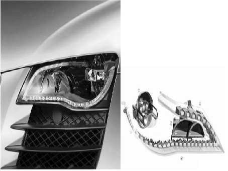 圖1 Audi A8 日間行車(chē)燈( 左) 及豐田全白光Nichia LED 前照燈( 右)