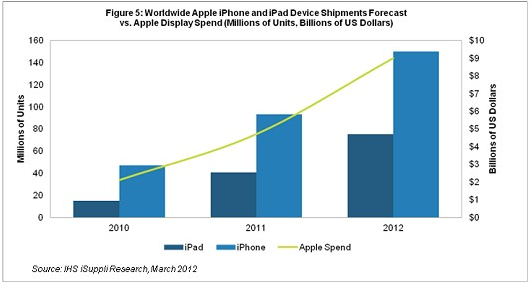 據(jù)IHS iSuppli公司的研究報(bào)告,由于預(yù)計(jì)iPhone和iPad產(chǎn)品出貨量今年大幅增長(zhǎng),蘋果2012年可能在這兩款產(chǎn)品的顯示器面板上面支出90億美元,進(jìn)一步確保其在平板電腦和手機(jī)市場(chǎng)中的主導(dǎo)地位。