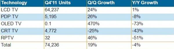 2011年第四季全球電視出貨量較去年同期下降4%,為7千420萬(wàn)臺(tái)。液晶電視出貨量?jī)H上升1%,為2004年以來(lái)最低;等離子電視下降了8%,CRT電視下降了43%。日本和西歐市場(chǎng)降幅最大,北美也僅維持少量增長(zhǎng),第四季度三個(gè)地區(qū)的電視總出貨量較去年同期下降了21%。新興市場(chǎng)電視出貨持續(xù)成長(zhǎng),增幅為12%,其中液晶電視出貨成長(zhǎng)了20%。