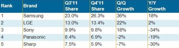 2011年第四季度,三星全球平板電視營(yíng)收占比提高到26.3%,為所有品牌歷史最高,且較第三季度提高了三個(gè)百分比。此外,在液晶電視和等離子電視方面,三星營(yíng)收占比仍然遙遙領(lǐng)先,且等離子電視占比首次超過松下而居于首位;三星也是3D電視和LED電視市場(chǎng)的領(lǐng)先品牌。樂金電子為全球第二大品牌,占比為13.4%,且是除了三星以外唯一一個(gè)前五大品牌中在第四季度取得營(yíng)收成長(zhǎng)的品牌。索尼排名第三,營(yíng)收占比為10%,但較去年同期下降了30%以上。