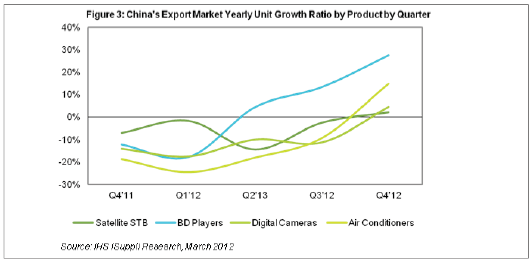 據(jù)IHS iSuppli公司的中國研究報告,全球經(jīng)濟增長速度低于預期將在2012年上半年損及中國消費電子出口市場,衛(wèi)星機頂盒(STB)、藍光光盤(BD)播放器、數(shù)碼相機和空調(diào)銷售將全面下滑。