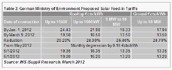 對(duì)于2012和2013年,德國(guó)政府確認(rèn)的年度安裝目標(biāo)是2.5-3.5GW,從2014年開(kāi)始,該目標(biāo)將每年下調(diào)400MW。表2所示為德國(guó)環(huán)境部所建議的FIT體系。