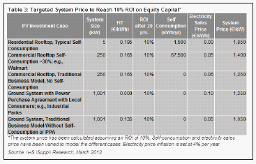 在FIT調(diào)整之后,IHS iSuppli公司的計(jì)算結(jié)果顯示,如果系統(tǒng)價(jià)格為1850歐元/kW,即使取消自我消費(fèi)獎(jiǎng)勵(lì),德國(guó)住宅系統(tǒng)仍能達(dá)到10%的股本(20%)投資回報(bào)率。由于德國(guó)市場(chǎng)的價(jià)格已經(jīng)降到這樣的水平,住宅領(lǐng)域?qū)⒗^續(xù)提供有吸引力的投資條件,盡管政府降低FIT。