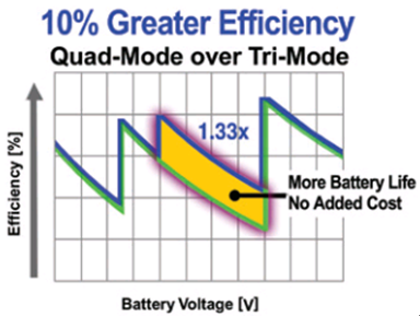 安森美半導(dǎo)體專利的四模(Quad-Mode®)自適應(yīng)分?jǐn)?shù)電荷泵的能效比市場(chǎng)上常規(guī)的三模電荷泵高出提供10%,并減小多達(dá)65%的封裝,將LED驅(qū)動(dòng)器的性能提升到了新的水平。Quad-Mode LED驅(qū)動(dòng)器通常可為基于電感的LED驅(qū)動(dòng)器提供高能效,同時(shí)消除較厚的電感和有害的EMI干擾。