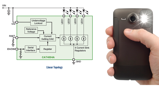 LED越來(lái)越多地應(yīng)用于拍照手機(jī)、智能手機(jī)和氙氣燈泡替代,且光輸出能力不斷提供,從而滿足更高的性能需求。安森美半導(dǎo)體的CAT3612、CAT4131、CAT4134和CAT3224都是這類驅(qū)動(dòng)方案。這些器件分別采用電荷泵、電感升壓拓?fù)浣Y(jié)構(gòu),可以提供不同的閃光電流和亮度。