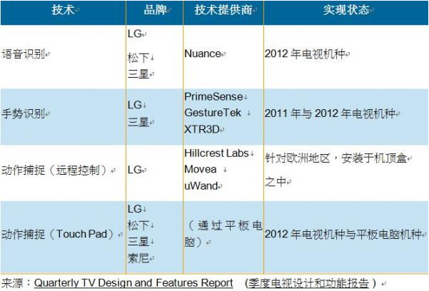 在2012年消費(fèi)性電子展(CES)上,語音識(shí)別和手勢(shì)識(shí)別的原型機(jī)首次展出;但事實(shí)上手勢(shì)識(shí)別功能已經(jīng)在市場(chǎng)上存在一段時(shí)間,只是未內(nèi)建在電視機(jī)里,例如Xbox游戲機(jī)的微軟Kinect手勢(shì)識(shí)別等。