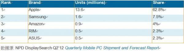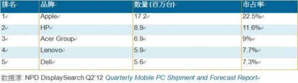 根據(jù)NPD DisplaySearch最新的季度Mobile PC出貨數(shù)量與預(yù)測(cè)報(bào)告初步調(diào)查結(jié)果,蘋果公司在2012年第一季出貨將近1,720萬臺(tái)Mobile PC,年成長率為118%。而約有80%的蘋果出貨來自iPad,第一季出貨量為1,360萬臺(tái),年成長率達(dá)162%。