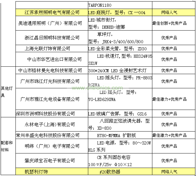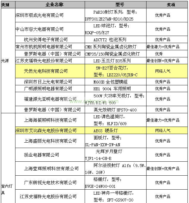 2012年6月9日,2012廣州國際照明展覽會開幕當(dāng)天,主辦方組織20名終審專家對終審會議評選出來的獲獎候選產(chǎn)品進(jìn)行現(xiàn)場的考核評審,最終確定35個優(yōu)秀產(chǎn)品獎,3個最佳創(chuàng)新獎、5個最佳潛力獎的獲獎名單;5個最佳網(wǎng)絡(luò)人氣獎是由網(wǎng)友海選出來的名單。