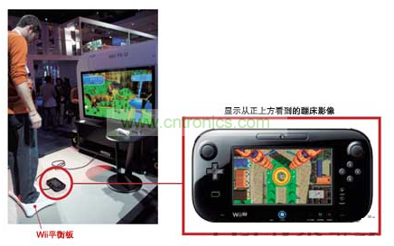 除了改變用戶立場來玩的游戲之外,任天堂還以使用雙屏幕實現(xiàn)更具臨場感的游戲體驗為目標。“Wii Fit U”中的蹦床游戲“Trampoline Target”就是一個很好的例子(圖4)??蓪Ⅲw重計式控制器“Wii平衡板”當做蹦床來操作。在平衡板旁邊的地板上放置的GamePad的畫面上,會顯示從正上方俯視蹦床的影像,蹦得越高蹦床就會變得越小,越接近蹦床就變得越大。這種顯示方法可使用戶感覺像自己真的在蹦床上彈跳一樣。