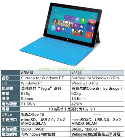 微軟的平板終端名為“Surface”,微軟讓W(xué)indows 8平板終端繼承了支持觸摸操作的桌面型計(jì)算機(jī)的名稱。新款終端備有配備ARM架構(gòu)SoC的“Surface for Windows RT”,以及配備x86處理器的“Surface for Windows 8 Pro”兩款機(jī)型,前者將與Windows 8同時(shí)上市(圖1)。