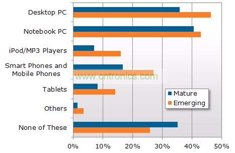 NPD DisplaySearch全球電視消費(fèi)者換機(jī)調(diào)查還對(duì)家庭戶進(jìn)行了關(guān)于在其他設(shè)備上收看電視視頻節(jié)目的調(diào)研,發(fā)現(xiàn)在新興市場(chǎng)越來(lái)越多的家庭使用除電視以外的設(shè)備,包括平板電腦、智能手機(jī)和MP3播放器。