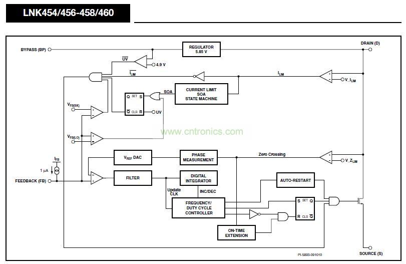 LinkSwitch-PL在一個器件上集成了一個高壓功率MOSFET開關及一個電源控制器。該IC器件提供單級功率因數(shù)校正和LED電流控制。LinkSwitch-PL控制器包括一個振蕩器、反饋(檢測及邏輯)電路、5.85 V穩(wěn)壓器、遲滯過熱保護、頻率抖動、逐周期限流、環(huán)路補償電路、自動重啟動、開關導通時間延長、功率因數(shù)以及恒流控制電路。