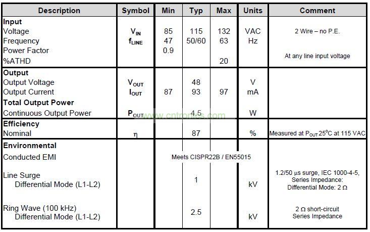 本文介紹采用PI LinkSwitch-PL系列非隔離單級(jí)LED驅(qū)動(dòng)器IC設(shè)計(jì)而成的針對(duì)B10型LED燈泡設(shè)計(jì)的高效率、超緊湊驅(qū)動(dòng)器——DER-297。它的單一恒流輸出功率為4.5W,可輕松配置從35V到100V的輸出電壓,如下表所示。