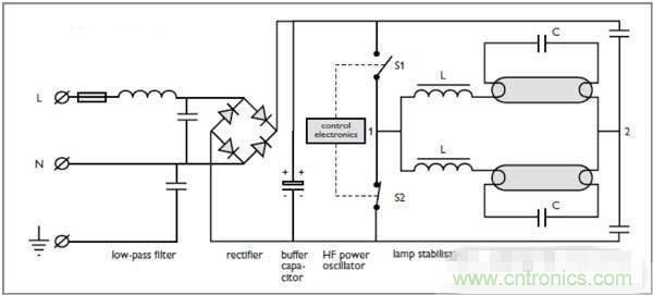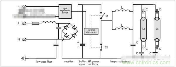 熒光燈的調(diào)光(1-10V)熒光燈的調(diào)光是在高頻電子鎮(zhèn)流器的基礎(chǔ)上研發(fā)出來(lái)的。下面是高頻電子鎮(zhèn)流器的線(xiàn)路圖: