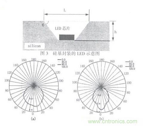MEMS技術(shù)是隨著半導體和微電子技術(shù)的發(fā)展麗發(fā)展起來的一項新興的細微加工技術(shù),加工尺寸從毫米到微米數(shù)量級,甚至亞微米的微小尺寸:其加T藝主要分為表面工藝和體工藝?;诠杌捏w工藝又稱為體硅工藝,體硅工藝呵以在硅基體上形成高深寬比的凹稽。由于MEMS的加工尺寸很小,因此利用該技術(shù)形成的微小凹槽作為LED芯片封裝的反射腔(如圖3),將會克服目前LED芯片直接封裝在PCB板上而引起發(fā)光效率低的問題;同時由于硅具有良好的導熱特性,因此可以降低目前封裝中熱阻高的問題,從而提高LED芯片的發(fā)光效率和可靠性。圖4(a)和(b)給出了當LED芯片直接貼裝在PCB板上和貼裝在有凹槽的硅基上的發(fā)光特性。從圈中可以看出,LED貼裝在帶有凹槽的硅基上以后其發(fā)出光的發(fā)散性能得到了很大的改善,LED的發(fā)光強度提高了75%以上。