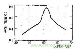 圖5為LED發(fā)射光與反射的反射角θ之間的關(guān)系,從圖中可看出當反射角為52度的時候反射光強取得最大。從理論上講,硅凹槽反射角應該設(shè)計為52度。但是,考慮到對(100)硅進行腐蝕的時候,其(111)面和(100)面會自動形成一個54.7度的角,而通過仿真分析結(jié)果可以計算。當反射角為54.7度的時候。LED的反射光強只比反射角為52度的時候小12%,而且光強分布也比較接近。因此在腐蝕凹槽的時候可以直接采用硅的(100)面和(111)面形成角度作為反射角,這可以極大的簡化加工工藝,降低制造成本,而且對LED光強的影響也不是很大。