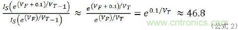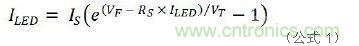 下面是圖1a行不通的原因所在。在公式1中,IS、RS是常數(shù),取決于LED產(chǎn)品本身,與VT是熱電壓無關(guān)。假設串聯(lián)電阻RS是理想值零,那么僅0.1V的VF變化就會產(chǎn)生47倍的ILED差異。