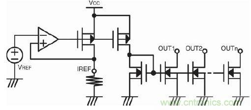 此外,我們都知道集成電路(IC)可提供良好的匹配電路對。這也是選擇恒流法的另一個優(yōu)勢。圖2是LED驅(qū)動器的基本輸出級結(jié)構(gòu)。市場上很多LED驅(qū)動器IC都有參考電流設置端 IREF,該參考電流是鏡像到其輸出端的恒流。