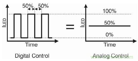 首先應決定使用數(shù)字控制還是模擬控制。前面已經(jīng)介紹過,經(jīng)過 PN 結(jié)點的總電荷數(shù)可決定光強度,因此數(shù)字和模擬方法均可控制光強度。圖3是數(shù)字和模擬法中的50%灰階控制。在總體256個色階的示例中,該50%表明了一個有128個灰階的目標。