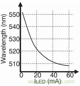 這時候,需要考慮電流變化對LED光輸出波長值的影響。改變波長就意味著改變?nèi)搜劭吹降纳?。圖4是綠色LED燈的實例。通常在業(yè)界,510nm 廣泛代表綠色。因此,大部分LED燈制造商所設計的LED燈產(chǎn)品在最大額定電流下都具備510nm的波長。在圖4中,隨著LED電流的升高,波長可達到510nm。獲得綠色的最佳方法是盡量使燈的驅(qū)動電流接近最大額定值。這也就說明了為什么使用數(shù)字控制比使用模擬控制好。