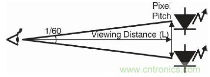 一套LED顯示系統(tǒng)包含大量的LED燈和一個大電源。設計系統(tǒng)時需要重點考慮LED燈的密度優(yōu)化問題。LED 燈的該密度稱為每個像素的距離或像素間距。如果像素間距太密,一旦超出了人眼能識別的精度,它就不會改善影像輸出質(zhì)量,而且會增加成本。人眼可識別的兩個單光源是在這兩點形成1個弧度的1/60(=1 弧分)時。