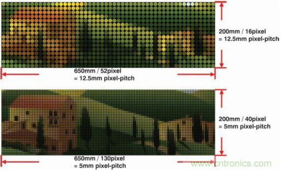 例如,5m視距的系統(tǒng)需要5mm像素間距來實現(xiàn)良好分辨率。另一個視覺實例如圖7所示,圖中展示了過低像素間距如何降低輸出影像質(zhì)量。像素間距為12.5mm 的影像(上)看起來很粗糙,無法近距離辨識。但保持一定的距離觀看時影像開始變得清晰,與觀看像素間距為5mm的影像(下)類似。這個實例清楚地說明了視距與像素間距的關(guān)系。