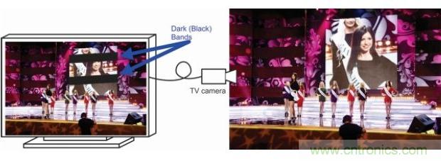 老式模擬電視通常在一秒鐘內(nèi)顯示24張不同的靜態(tài)影像,幀速率為24。當模擬電視攝像機拍攝另一個模擬電視屏幕時,可產(chǎn)生由視頻影像與黑色條帶構(gòu)成的斑馬紋混合畫面(圖9)。這種現(xiàn)象由同步電視攝像機和電視屏幕掃描率引起。在拍攝LED屏幕的攝像機采用時分復用陽極驅(qū)動器時,也會出現(xiàn)相同的問題。應用實例包括使用電視攝像機拍攝背景墻壁上由LED顯示器放大演員的舞臺影像或者用電視攝像機拍攝體育場中體育賽事比分牌或標牌等。要避免這個問題,LED顯示器現(xiàn)在需要比攝像機系統(tǒng)運行得更快,特別是在專用LED顯示器市場。