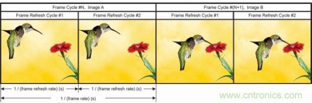 為滿足更快運行這一要求,很多LED顯示系統(tǒng)都在一個幀周期內(nèi)反復顯示相同的影像,稱為幀刷新率。圖10是幀速率與刷新率的關(guān)系。只有兩張幀影像:A 和 B。每個幀重復“影像 x”兩次。因而本實例“幀刷新率”= 2 ד幀速率”。