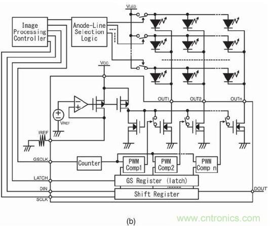 圖11b是采用PWM控制IC的系統(tǒng),具有一個可參考時鐘計數(shù)器的灰階參考時鐘輸入端。另外,該IC還具有一組保存灰階邏輯代碼的寄存器。PWM 比較器可通過計數(shù)器和灰階 (GS)寄存器比較和生成PWM輸出模式。