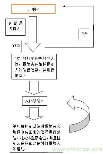 系統(tǒng)初始化之后,對(duì)狀態(tài)進(jìn)行判斷,若沒(méi)檢測(cè)到人,則一直處于檢測(cè)狀態(tài);若檢測(cè)到有人,則單片機(jī)控制IO口打開(kāi)開(kāi)關(guān)使得LED射燈發(fā)光照射到人體,攝像頭開(kāi)始捕捉人體位置信息,并進(jìn)行定位;當(dāng)人體移動(dòng)時(shí),單片機(jī)控制系統(tǒng)對(duì)熱釋電和攝像頭傳回來(lái)的信號(hào)進(jìn)行處理,對(duì)人體重新進(jìn)行定位,并且控制云臺(tái)轉(zhuǎn)動(dòng)使射燈跟隨人體運(yùn)動(dòng);當(dāng)人體再移動(dòng),便繼續(xù)“人體移動(dòng)----數(shù)據(jù)處理---轉(zhuǎn)動(dòng)云臺(tái)”這個(gè)循環(huán)過(guò)程。