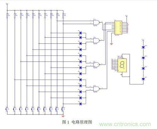 如圖1所示,電路由與非門74LS00、數(shù)碼管驅(qū)動芯片74LS247組成。10個按鍵組成輸入電路,經(jīng)過與非門電路編碼后,輸入數(shù)碼管驅(qū)動芯片,驅(qū)動數(shù)碼管顯示相應(yīng)的按鍵號。