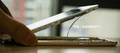 注意音量、電源按鍵的FPC,接口在主板側(cè)。按鍵不直接放在主板上還是有點(diǎn)講究的,因?yàn)榻饘贆C(jī)身遭遇不慎的話可能會(huì)變形,而變形后主板與按鍵(鍵帽)之間容易出現(xiàn)錯(cuò)位從而影響按鍵手感/功能,因此把按鍵整合在后殼上,再用FPC連接主板,怎么摔按鍵也能按。