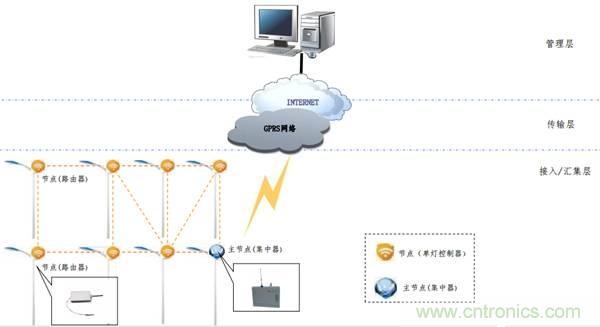 下行:通過(guò)zigbee無(wú)線方式和控制節(jié)點(diǎn)(單燈)通信;上行:通過(guò)GPRS等方式與監(jiān)控中心通信;