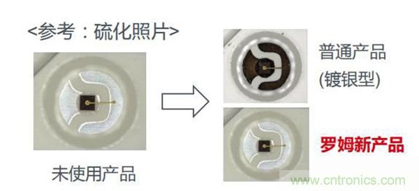 通過對比得出ROHM新產(chǎn)品的優(yōu)勢:一是能保持亮度,二保護芯片鍵合材料不受損壞,三無需其他保護對策。