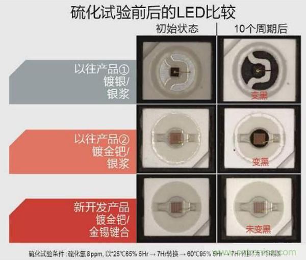 在硫化試驗中,以往使用鍍銀框架及銀漿的產(chǎn)品的光通量在一個周期(24小時)后為70%,10個周期后為60%,時間越長其光通量越低;而新產(chǎn)品可在10個循環(huán)(240小時)后依然保持幾乎100%的高光通量 。