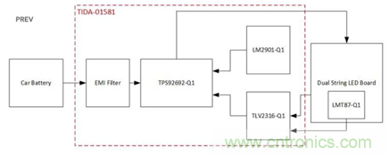 該方案采用升壓配置的TPS92692-Q1多拓撲LED驅動器來驅動LED。TPS92692-Q1具有用于電磁干擾(EMI)性能的擴頻頻率調制,模擬電流調節(jié)和內部脈寬調制(PWM)調光。這種設計包括使用LMT87-Q1的可調線性熱折返模擬溫度傳感器以及電流限制,以防止鏡像串無法打開電路。該設計還具有兩種亮度模式:一種模式是全亮度模式,另一種是降低亮度的PWM調光模式。