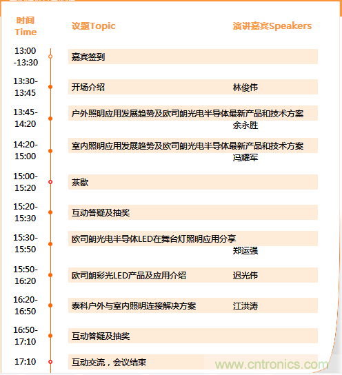 本次研討會特邀新曄電子市場總監(jiān)林俊偉、歐司朗光電半導(dǎo)體通用照明事業(yè)部市場工程師余永勝、歐司朗光電半導(dǎo)體市場部經(jīng)理馮耀軍、歐司朗光電半導(dǎo)體多元市場事業(yè)部中國區(qū)市場工程師鄭運強、歐司朗光電半導(dǎo)體通用照明事業(yè)部高級應(yīng)用工程師遲光偉、泰科工業(yè)事業(yè)部亞太區(qū)資深照明領(lǐng)域產(chǎn)品經(jīng)理江洪濤等,他們將在現(xiàn)場為大家具體解讀LED舞臺照明領(lǐng)域的最新技術(shù)進展與市場趨勢。