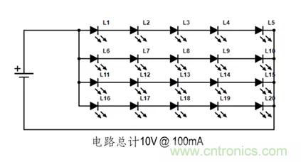 一般說來, 大多數(shù)LED照明都使用串并聯(lián)組合。如下圖: