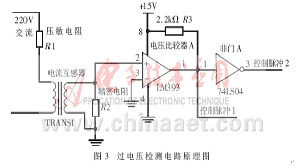 過電壓檢測(cè)電路原理圖如圖3所示。當(dāng)有過電壓信號(hào)產(chǎn)生時(shí),壓敏電阻被擊穿,呈現(xiàn)低阻值甚至接近短路狀態(tài),這樣在電流互感器的原級(jí)產(chǎn)生一個(gè)大電流,通過線圈互感作用在副級(jí)產(chǎn)生一個(gè)小電流,再通過精密電阻把電流信號(hào)轉(zhuǎn)變?yōu)殡妷盒盘?hào);這個(gè)信號(hào)輸入到電壓比較器LM393后,電壓比較器LM393輸出高電平,經(jīng)過非門A輸出的控制脈沖1控制電源回路,斷開開關(guān)電源電路,啟動(dòng)備用電源??刂泼}沖2 送到單片機(jī)的中斷口,單片機(jī)控制回路啟動(dòng)A/D轉(zhuǎn)換,采樣過電壓的瞬時(shí)值。