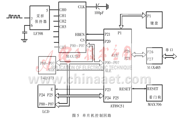 單片機(jī)控制回路如圖5所示。它的主要功能是完成對(duì)過電壓的瞬時(shí)值和峰值的檢測(cè)、過電壓次數(shù)的檢測(cè)、電源輸出電壓和電流的檢測(cè),并通過鍵盤的操作顯示出各個(gè)檢測(cè)值的大小;同時(shí)通過485接口和上位機(jī)實(shí)現(xiàn)通訊,在有過電壓的時(shí)候通過控制回路啟動(dòng)備用電源,實(shí)現(xiàn)對(duì)電源本身的保護(hù)。